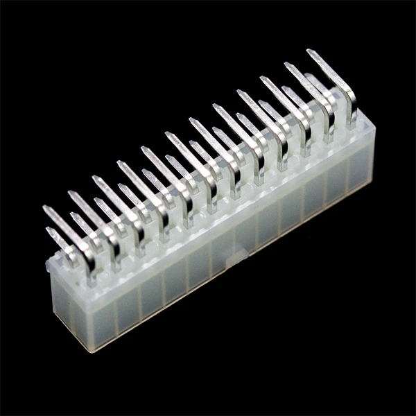 This is a right-angle, 24-pin Molex Mini-Fit Jr.™ connector, commonly used as the power supply connector on ATX motherboards. Two rows of twelve pins are broken out two rows of through-hole male headers. See the datasheet below for pin spacing dimensions.