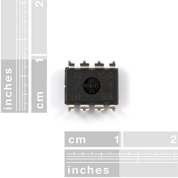 Atmel’s itty-bitty ATtiny85 8-Bit Processor. 8K of program space, 6 I/O lines, and 4-channel 10 bit ADC. Runs up to 20MHz with external crystal. Package can be programmed in circuit.