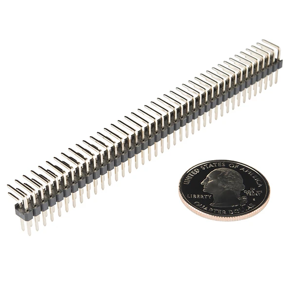 This is a 2×40 pin right-angle PTH header. This header can be broken apart with a fair amount of force to form smaller header formations. Don’t worry, it’s easy enough to break it where you need! Each pin has a spacing of 0.1″ in between each other.