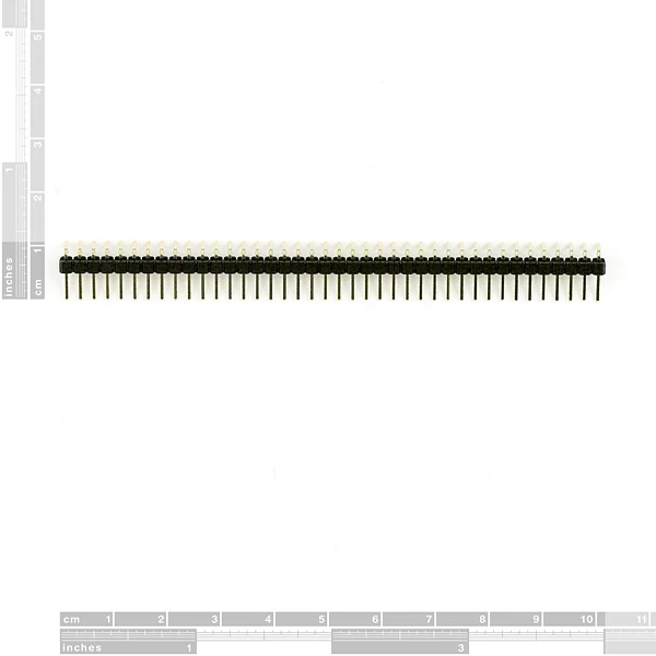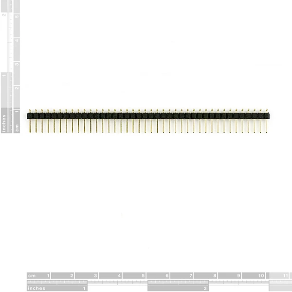 A row of right angle male headers – break to fit. 40 pins that can be cut to any size. Used with custom PCBs or general custom headers.