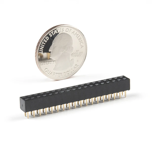 This is a 2×18 pin female header. Each pin has a spacing of 0.1″ in-between each other.