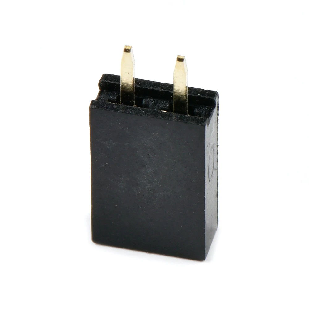 These are standard 0.1″ spaced header pins that can be through-hole mounted. This header connects perfectly with most 2-pin male headers.