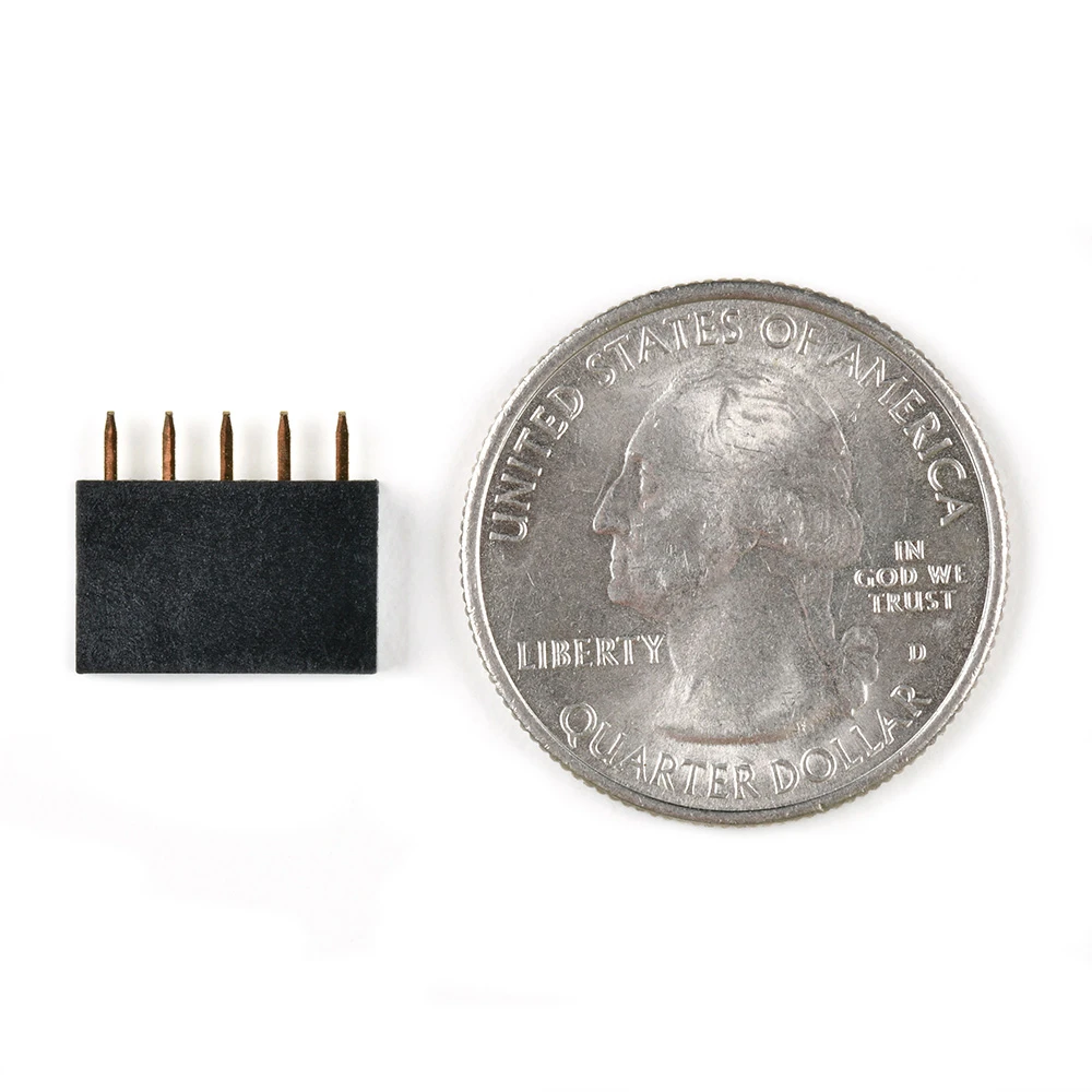 These are standard 0.1″ spaced header pins that can be through-hole mounted. This header connects perfectly with most 5-pin male headers.