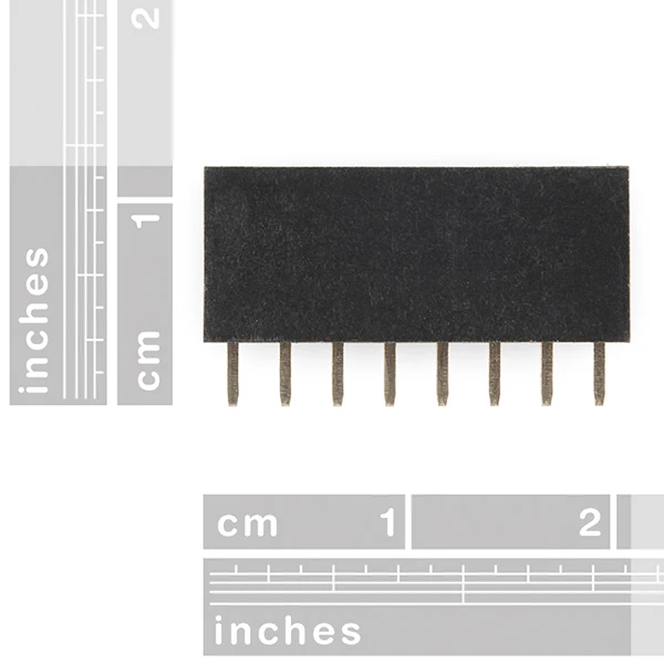 These are standard 0.1″ spaced header pins that can be through-hole mounted. This header connects perfectly with most 8-pin male headers.