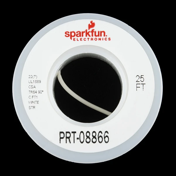 Standard 22 AWG stranded white wire. Use this for soldering wire or any project in which you need flexible wire. Stranded wire is recommended for projects where the wire has a bend or stress point. Comes in small spools of 25′.