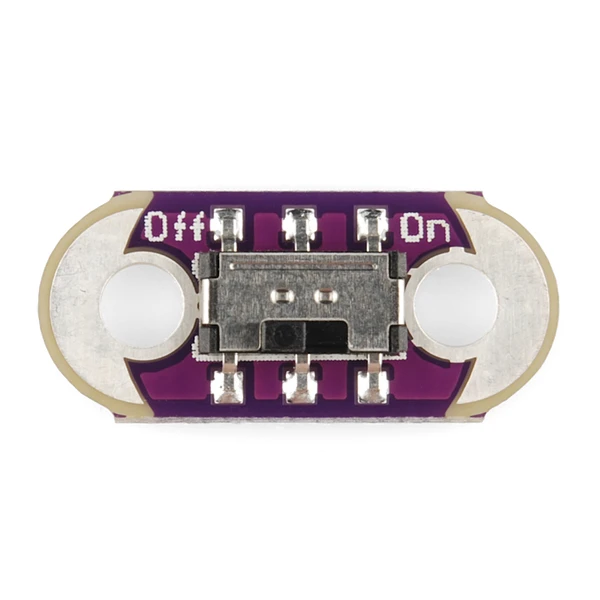 This is a simple slide switch for the LilyPad. Use it as a simple ON/OFF switch, or to control LEDs, buzzers, sensors, etc. The swtiches on each board are rated for 4 volts at 300mA, but will work at 5 volts with a reduction in current.