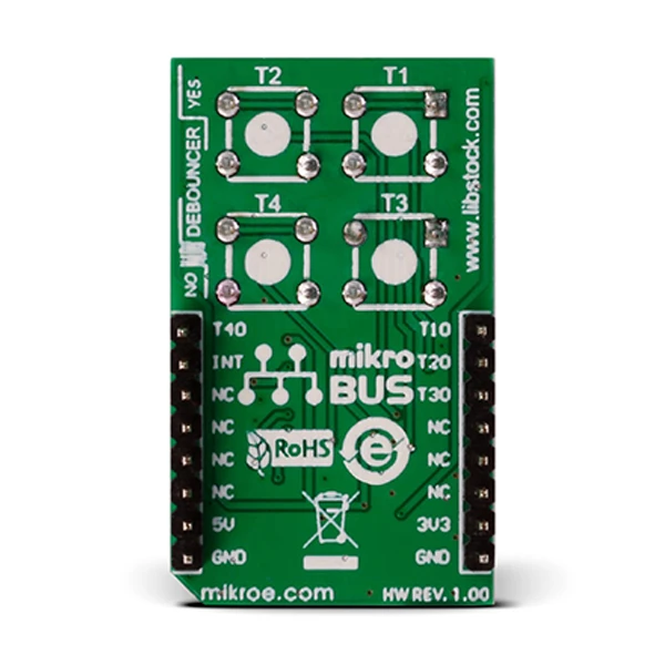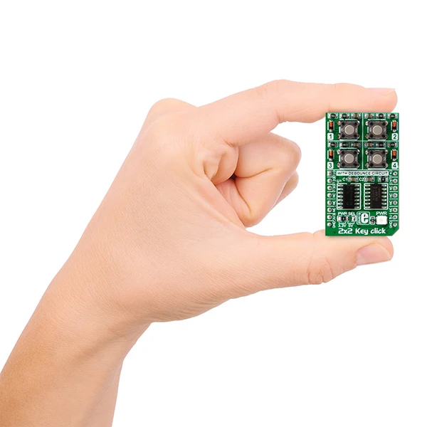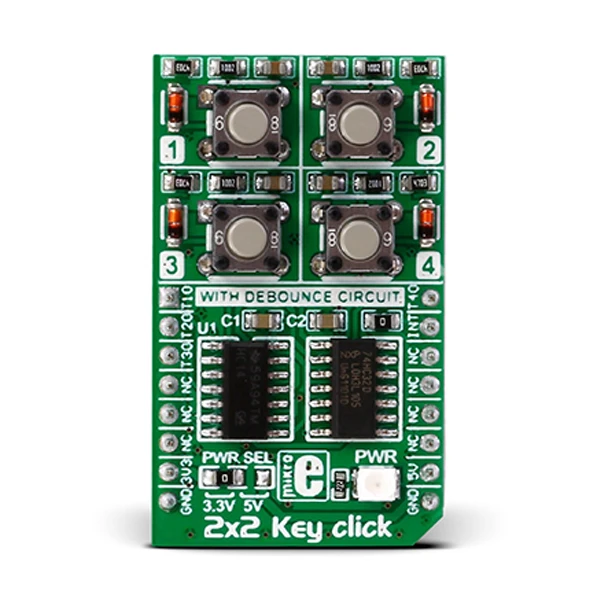 2×2 Key Click has a 4 button keypad. The Click allows multiple key presses and has a debounce circuit composed of 74HC32 quad 2-input OR gate from NXP and the SN74HC14 Hex Schmitt-Trigger Inverter from Texas Instruments. 2×2 Key Click is designed to use either 3.3V or 5V power supply. The buttons can be independently read.