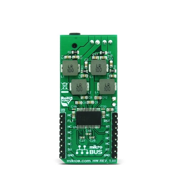2x30W Amp Click is designed to work with 2 channels of a single-sided audio source, connected via the 3.5mm stereo audio jack, which is provided on board.