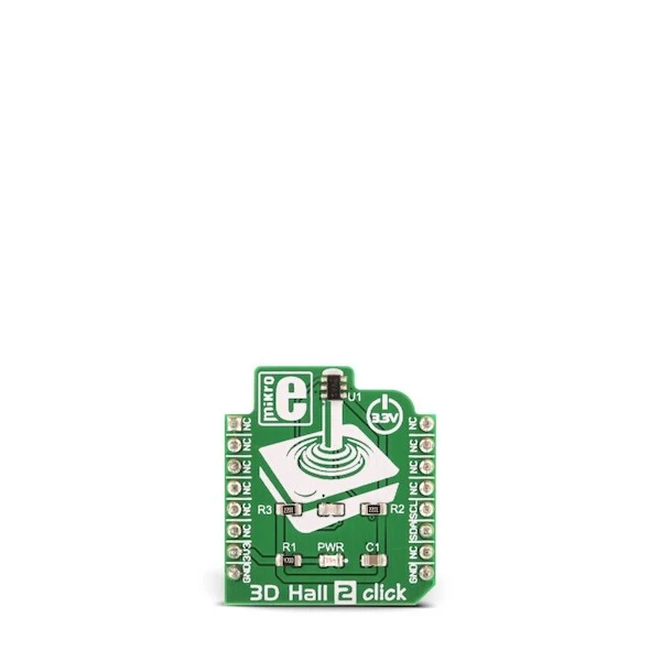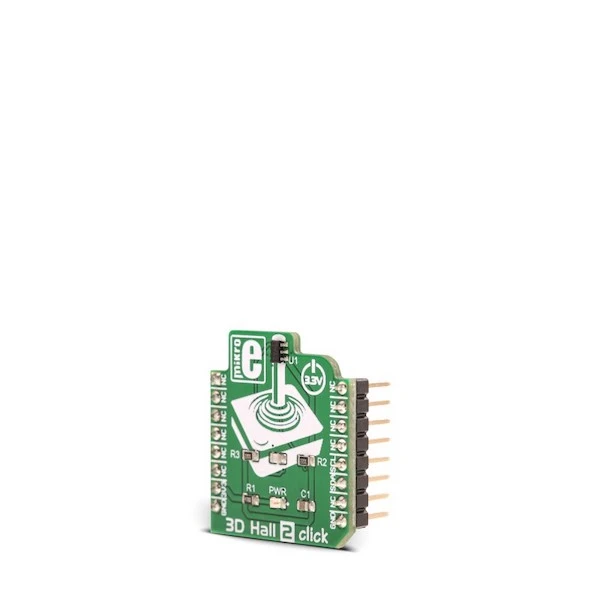 3D Hall 2 Click is a very accurate magnetic field sensing Click board™, used to sense the magnetic field strength in three perpendicular axes. It relies on a TLV493D-A1B6, a low power 3D magnetic sensor from Infineon. This sensor has a separate Hall sensor for each axis, which allows a very reliable magnetic field sensing in 3D space, offering basis for accurate angle calculations. The TLV493D-A1B6 sensor uses industry standard I2C communication interface and requires a very low count of external components. The I2C interface is also used for the chip reset, so the sensor features a very low count of pins.