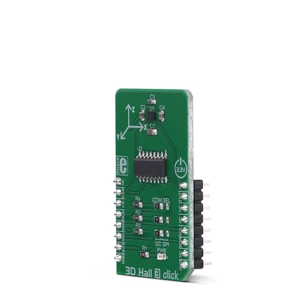 Features such as the embedded self-test, support for the hard iron compensation, selectable power mode, 16-bit data output, a wide dynamic range of the measurement (±50 gauss), make this Click board™ a perfect choice for various IoT applications. The internal non-volatile memory contains the calibration parameters, making the 3D Hall 3 Click a very accurate magnetic sensor, perfectly suited for the development of various position sensing applications, contactless knobs, encoders, switches, potentiometers, or some other type of magnetic field sensing applications based on the accurate spatial sensing.