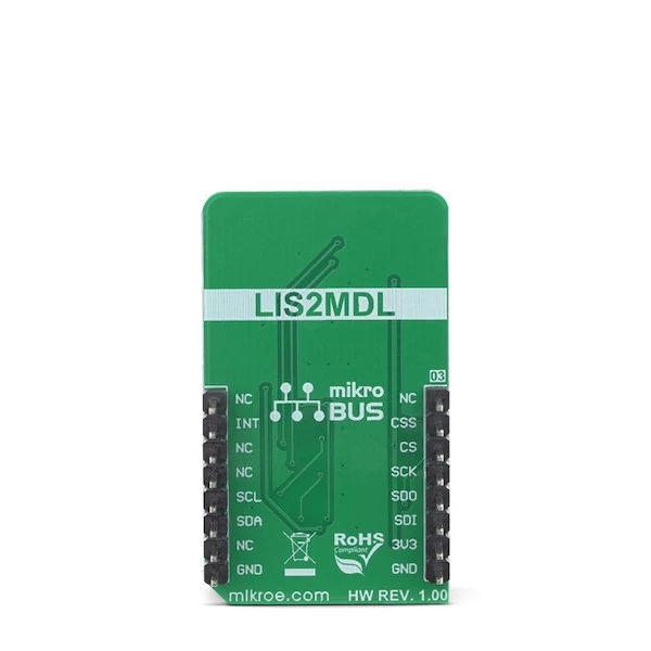 The LIS2MDL magnetic sensor also features a powerful programmable interrupt engine, which allows many event sources to be signaled via the interrupt pin (INT/DRDY), which is routed from the sensor to the mikroBUS™ INT pin. A very useful function of the interrupt engine is the signaling of the data ready event. That way, the host MCU does not have to poll the sensor for the data acquisition. The sensor can simply trigger an interrupt when the data is ready for reading. The interrupt engine allows some other customizations of the interrupt signal, such as the polarity, pulse/latch mode, and so on.