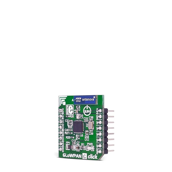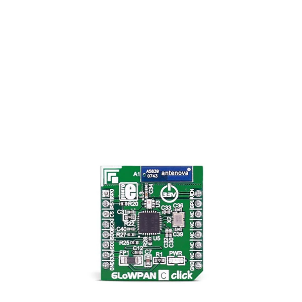 MIKROE 6LoWPAN C Click carries the CC2520 2.4GHz RF transceiver. The click is designed to run on a 3.3V power supply. It communicates with the target microcontroller over SPI interface, with additional functionality provided by the following pins on the mikroBUS™ line: PWM, INT, RST, AN.