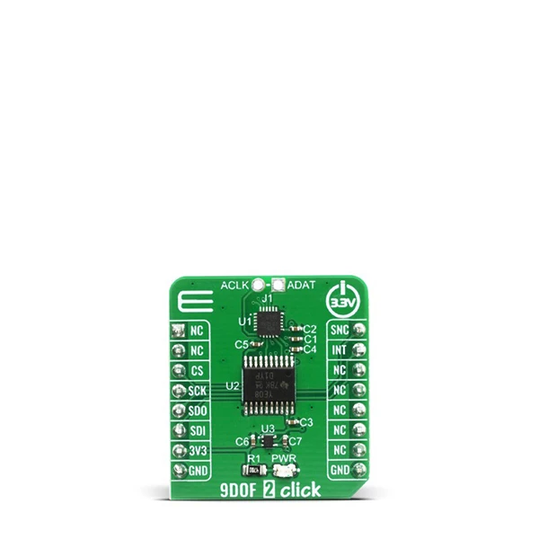 9DOF 2 Click is based on the ICM-20948, a high performance, 9-axis MotionTracking™ IC from TDK Invensense. ICM-20948 also supports an auxiliary I2C interface to external sensors which offer a greater system flexibility. The output of each MEMS is processed and digitized by a separate sigma-delta 16-bit A/D converter (ADC). Three-axis gyroscope MEMS can be programmed to measure the rotation about each axis, in four different ranges of rotational speed (degrees per angle, DPS): ±250, ±500, ±1000, and ±2000. Three-axis accelerometer MEMS can be programmed to measure the acceleration along each axis, in four different acceleration ranges: ±2g, ±4g, ±8g, and ±16g. Three-axis magnetometer can do a full scale measurement of ±4900 µT.