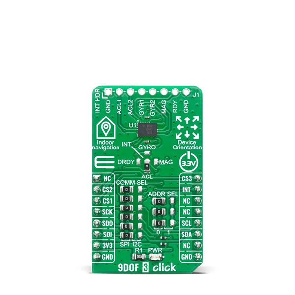 9DOF 3 Click introduces the BMX055, a small-scale absolute orientation sensor in the class of low-noise 9-axis measurement units, from Bosch Sensortec. It comprises the full functionality of a triaxial, low-g acceleration sensor, a triaxial angular rate sensor and a triaxial geomagnetic sensor. All three sensor components of the BMX055 can be operated and addressed independently from each other. On top, the BMX055 integrates a multitude of features that facilitate its use especially in the area of motion detection applications, such as device orientation measurement, gaming, HMI or menu browser control. 9DOF 3 Click offers both SPI and I2C digital interfaces for easy and fast system integration.