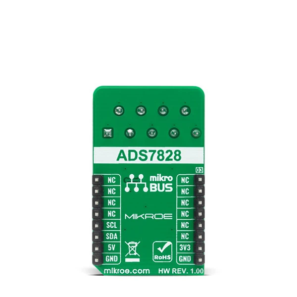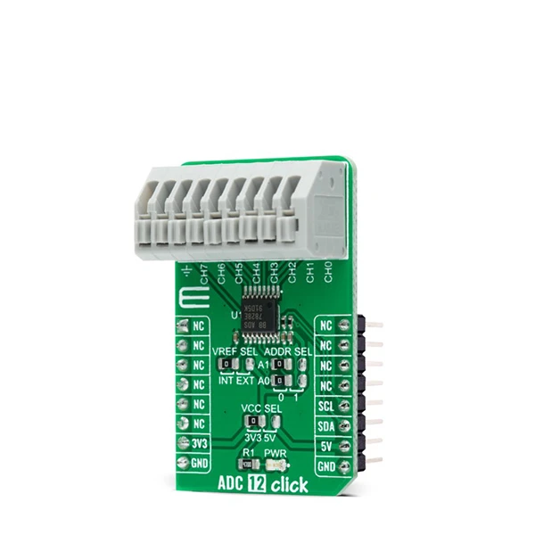ADC 12 Click is a compact add-on board that contains a fully-featured, general-purpose analog-to-digital converter. This board features the ADS7828, a low-power 12-bit data acquisition device that features a serial I2C interface and an 8-channel multiplexer from Texas Instruments. The A/D converter features a sample-and-hold amplifier and an internal, asynchronous clock. The combination of an I2C serial interface, up to eight differential analog inputs, built-in reference with buffered output, and micro-power consumption makes this Click board™ ideal for applications requiring the A/D converter to be close to the input source in remote locations and for applications requiring isolation.