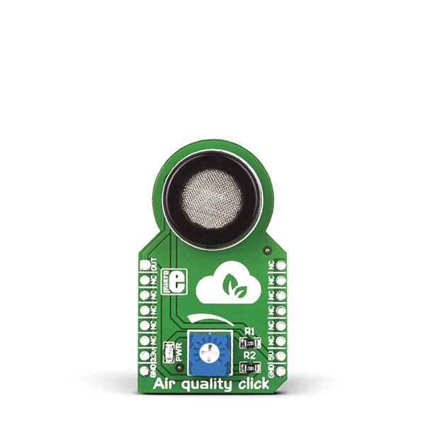 MIKROE Air Quality Click is a simple solution for adding a high sensitivity sensor for detecting a variety of gases that impact air quality in homes and offices. It carries an MQ-135 sensor. The Click is designed to run on a 5V power supply. It communicates with the target microcontroller over the AN pin on the mikroBUS™ line.