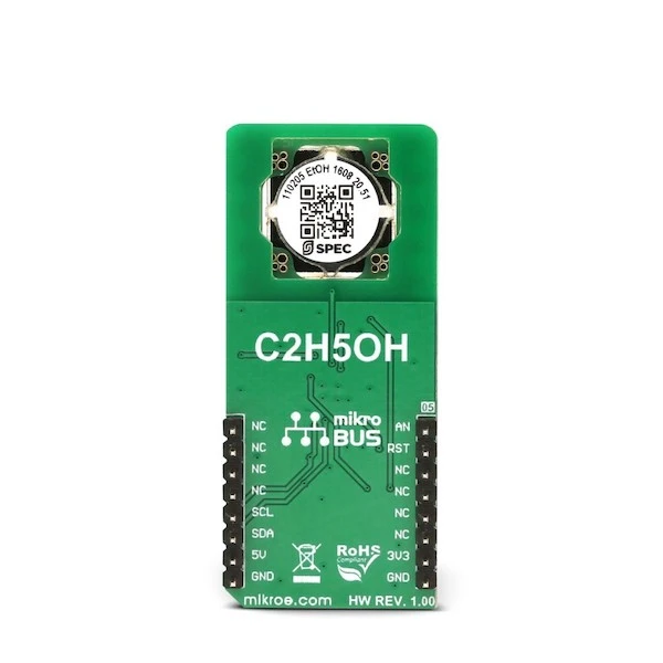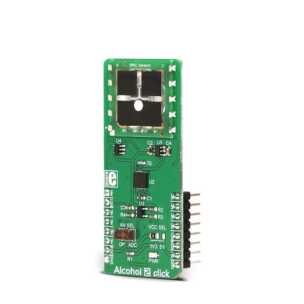 Alcohol 2 Click is a very accurate ethanol gas (alcohol) sensor Click board™, equipped with the SPEC amperometric gas sensor which electrochemically reacts with the ethanol. It is supported by the LMP91000, a high-precision integrated analog front-end IC (AFE), perfectly suited for use in electrochemical sensing applications. The Click board™ also provides the reference voltage required by the sensor and offers a choice between the analog output from the AFE IC buffered with the low noise op-amp, and digital output from the 12-bit SAR A/D converter.