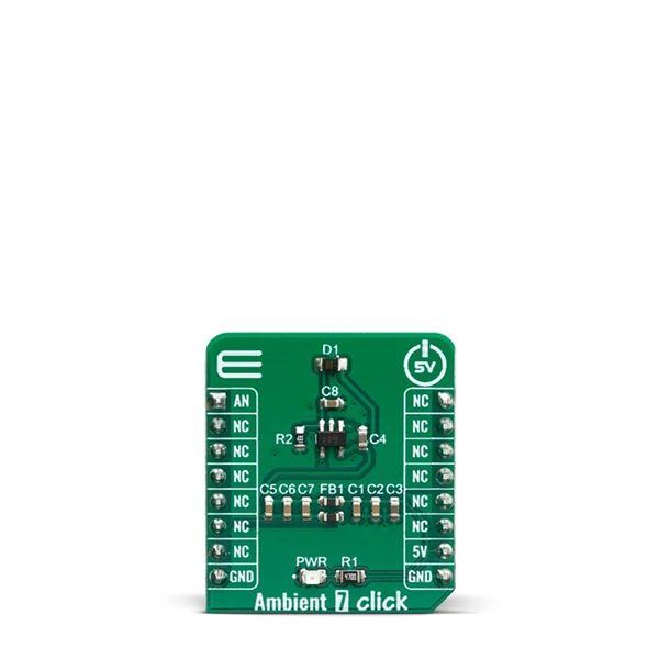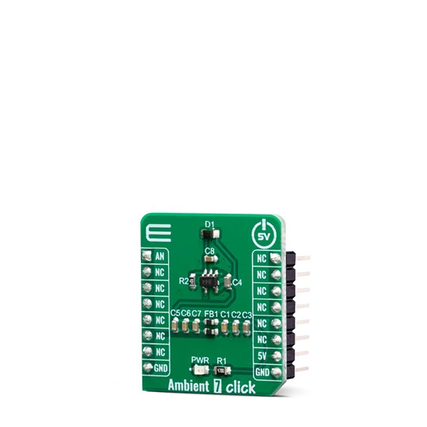 Ambient 7 Click is a light intensity-sensing and measuring Click board™, which features an accurate light-intensity sensor labeled as SFH 5701 A01, made by Osram Opto Semiconductors. It offers a high measurement accuracy in wide range of the actual light intensity. The spectral response of the sensor is calibrated to closely match the spectral response of the human eye. Thanks to its high level of integration, the sensor requires a minimal number of external components.