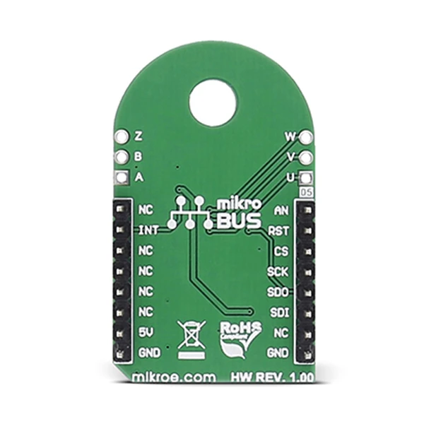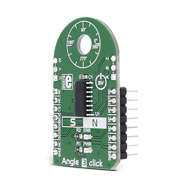 Angle 3 Click carries the AK7451, a magnetic rotational angle sensor. The Click is designed to run on a 5V power supply. It communicates with the target microcontroller over SPI interface, with additional functionality provided by the INT pin on the mikroBUS™ line.