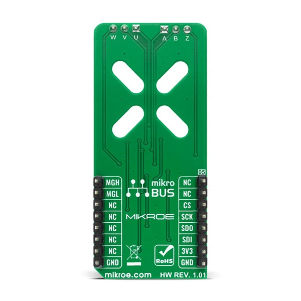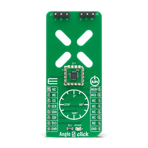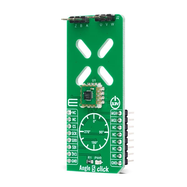 This Click board™ possesses an incremental encoder and block commutation function that uses three output pins each: ABZ and UVW. The ABZ output emulates a 10-bit incremental encoder (such as an optical encoder) providing logic pulses in quadrature, while the UVW output emulates the three Hall switches usually used for the block commutation of a three-phase electric motor. The ABZ and UVW pins of the MA302 are routed on two standard 2.54 mm (0.1 inches) pitch 1×3 header, mounted on the Angle 5 Click, so it can be easily accessed by an external application.