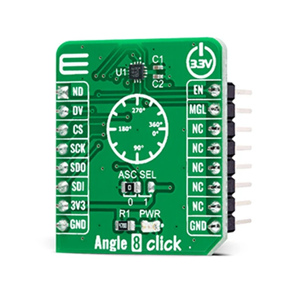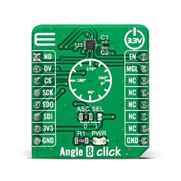 Angle 8 Click is a compact add-on board that detects the absolute angular position of a permanent magnet. This board features the MA782GGU, a low-power angle sensor with integrated wake-up angle detection from Monolithic Power Systems. With its power cycling ability, the MA782GGU can be optimized for applications that require low average power. It supports a wide range of magnetic field strengths and spatial configurations, with both end-of-shaft and off-axis (side-shaft mounting), supported configurations. Fast data acquisition and processing provides accurate angle measurement at an applied magnetic field of 60mT, alongside magnetic field strength detection with programmable thresholds. This Click board™ is suitable for general-purpose angle measurements, in embedded motion control applications, as a power/speed control trigger solution, and more.