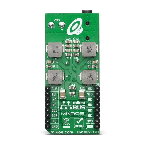 Although the TAS5414 IC requires an external PSU, The Click board™ can operate with 3.3V MCUs only, it is set to work over the I2C by default, and it is already equipped with the pull-up resistors. It is ready to be used as soon as it is inserted into a mikroBUS™ socket of the development system.