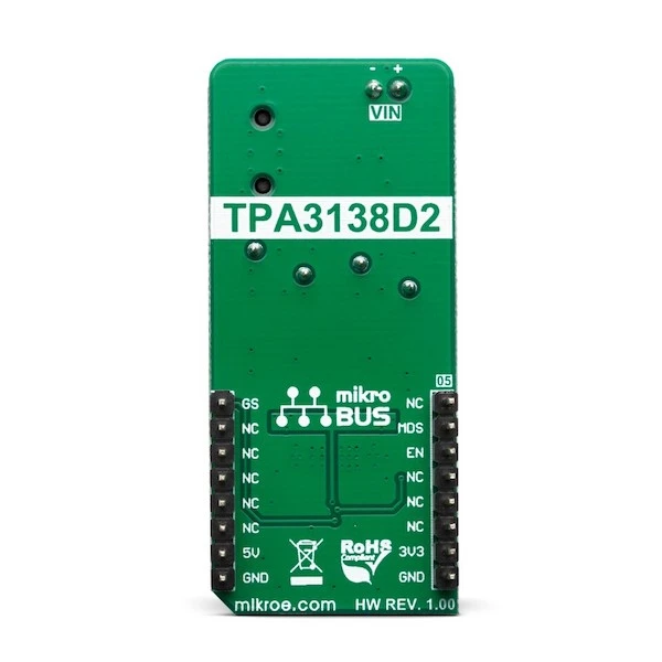 Although the TPA3138D2 IC requires an external PSU, it still uses power from the mikroBUS™ for the logic levels of its control pins. There is a logic voltage level selection SMD jumper labeled as VCC SEL, which allows interfacing with both 3.3V and 5V-tolerant pins of the host MCU.