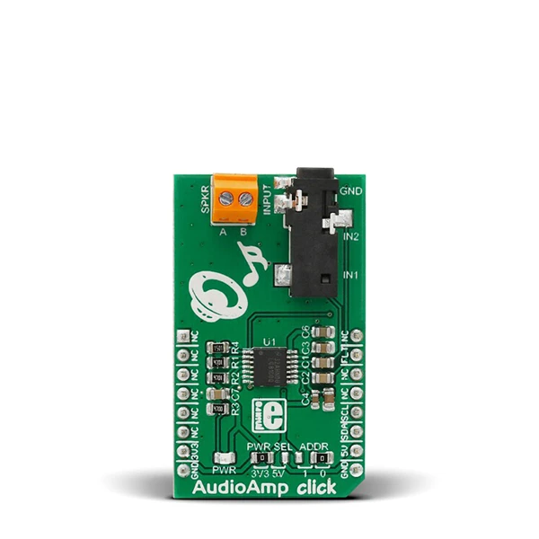AudioAmp Click has one 3.5 mm input jack and next to it screw terminals for connecting output wires to a passive speaker. It has dual audio inputs that can be mixed/multiplexed to the device output. Each input path has its own independent, 32-step volume control. The mixer, volume control and device mode selection are controlled through the mikroBUS™ I2C interface.