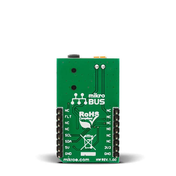 AudioAmp Click can work either on a 3.3V or a 5V power supply. There’s an additional jumper for selecting the I2C address as well. The open-drain output fault flag. FAULT is routed through the default mikroBUS™ INT pin (0 indicates that a fault condition has occurred).