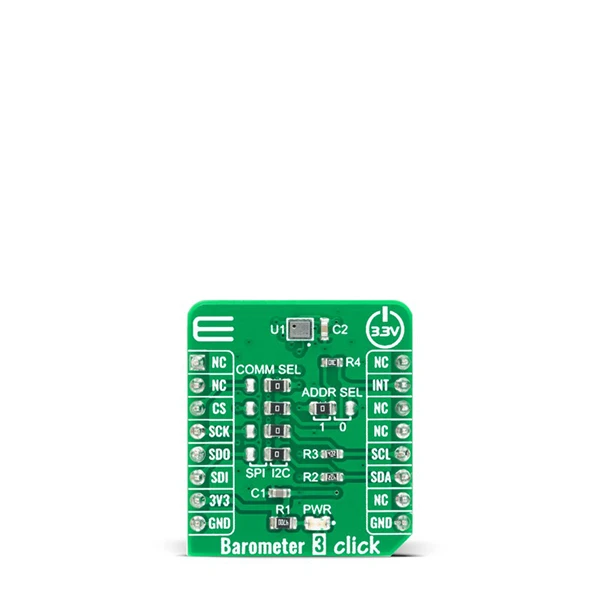 Barometer 3 Click is a compact add-on board for applications which require digital barometric air pressure measurement. This board features the DPS368, a digital barometric air pressure sensor from Infineon. It offers a high accuracy and a low current consumption, capable of measuring both pressure and temperature. The pressure sensor element is based on a capacitive sensing principle which guarantees high precision during temperature changes and due to its robustness it can be used in harsh environment. Its also ideally suited for wearable sensors (such as fitness tracking, step counting, fall detection), home appliances (for air flow control in HVAC, water level detection, intruder detection) and health care (for fall detection, air flow monitoring, smart inhalers).