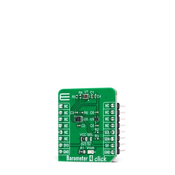 MIKROE Barometer 4 Click is a compact add-on board used to measure air pressure in a specific environment. This board features the ICP-10111, a high accuracy low power barometric and temperature sensor from TDK InvenSense. The ICP-10111 is based on MEMS capacitive technology providing ultra-low noise at the lowest power, enabling industry-leading relative accuracy, sensor throughput, and temperature stability. It comes with a configurable host interface that supports I2C serial communication and measures pressure in a range from 30kPa up to 110kPa with an accuracy of ±1Pa over a wide operating temperature range. This Click board™ is suited for various pressure-based applications, especially when low power consumption is required, home appliances such as airflow control in HVAC, water level detection, vertical velocity monitoring, weather forecasting, and many more.