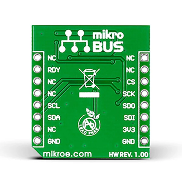 Barometer Click carries the LPS25HB IC, which is a piezoresistive absolute pressure sensor with a measurement range from 260 to 1260 hPa (with a 24-bit resolution output). It’s a high precision sensor: n high resolution mode it can measure pressure within 0.01 hPa RMS. A low resolution mode can be implemented to reduce power consumption. Barometer Click can communicate with the target board MCU either through I2C or SPI pins (which is specified by soldering onboard jumpers in appropriate position). An interrupt pin is also available, which can be configured either as Data Ready (sends signal when pressure value changes) or as a threshold trigger (sends signal when specified high or low pressure value is reached). The board uses a 3.3V power supply only.