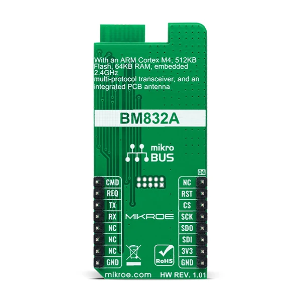 BLE 12 Click is a compact add-on board that provides BT/BLE connectivity for any embedded application. This board features the BM832A, a powerful and highly flexible, ultra low power Bluetooth Low Energy (BLE) module from Fanstel. Based on the Nordic nRF52 SoC, the BM832A supports Bluetooth 5.0 Low-Energy (BLE) connectivity while delivering RF range and performance, debugging and enhanced security features, and low power consumption. It also comes with an ARM Cortex™ M4(F) MCU up to 192kB flash and 24kB RAM, embedded 2.4GHz multi-protocol transceiver, and an integrated PCB trace antenna. This Click board™ is suitable for low-cost Bluetooth low energy applications such as building automation and sensor networks, portable medical, connected home, and more.