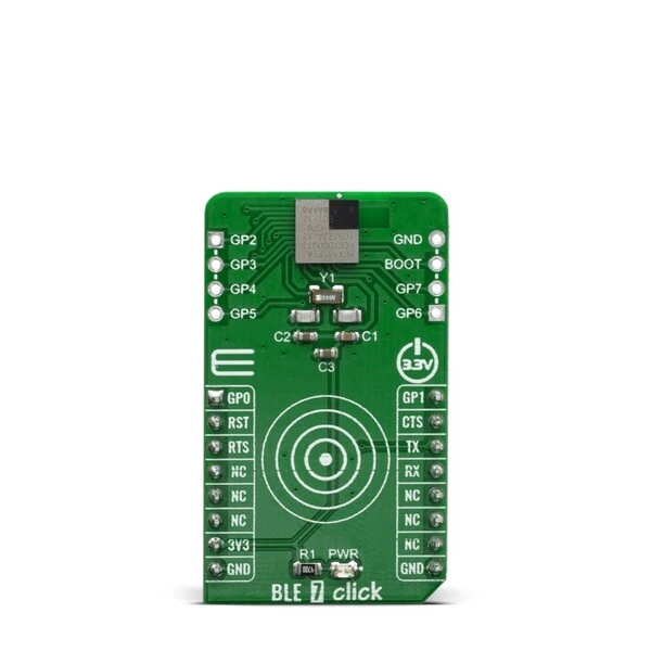 The BLE 7 Click is a Click board™ based on the BGX13S22GA-V31, a module from Silicon Labs that has some impressive features including the fact that it is Bluetooth 5 low energy compliant, GPIO control through command API, Encrypted bonding and connectivity and an Integrated DC-DC Converter.