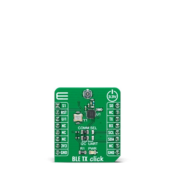 BLE TX Click possesses a miniature coaxial N.FL series antenna connector which in combination with IPEX-SMA cable allows connecting the appropriate antenna, such as WIFI Antenna 2.4GHz right angle SMA or WIFI Antenna for improved range and received signal strength.