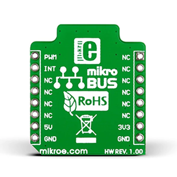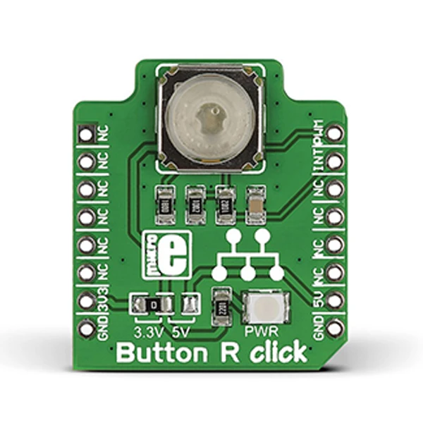 Button R Click is the simplest solution for adding a single pushbutton to your design. The button itself is transparent, 6.8mm in diameter and has a red LED backlight. When pressed, it sends an interrupt signal to the target board microcontroller. The backlight LED is controlled separately through the mikroBUS PWM pin, so you can program all kinds of patterns (varying level of light intensity or rate of blinking on subsequent button presses). The board can use either a 3.3V or a 5V power supply.