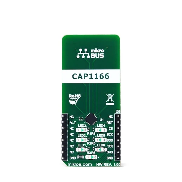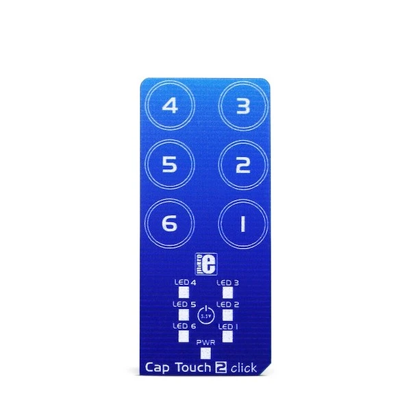 Cap Touch 2 Click is a capacitive touch sensing Click board™ which features the CAP1166, an advanced touch/proximity sensor IC, packed with a range of different touch/proximity functionalities, allowing development of robust and aesthetically pleasing touch interfaces. Besides six touch sensitive channels, the sensor IC has six independent LED drivers, with several operating modes, including touch sensor linking, as well as the pulsing and breathing effects. It also supports Multiple Touch Pattern Detection (MTPD), and press-and-hold function. Capacitive touch sensor inputs are protected from false detections, which can be caused by the low noise and RF interferences, providing a very reliable touch sensing functionality.