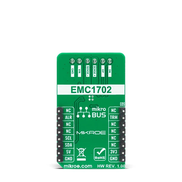 Current 3 Click is based on the EMC1702, a combination of the high-side current sensing device with a precision voltage and temperature measurement capabilities from Microchip. It measures the voltage developed across an external sense resistor to represent the high-side current of a battery or voltage regulator, and also measures the source voltage and uses these measured values to present a proportional power calculation. The EMC1702 contains additional bi-directional peak detection circuitry to flag instantaneous current spikes with programmable time duration and magnitude threshold. Also, it possesses an external diode channel for temperature measurement as well as an internal diode for ambient temperature measurements.