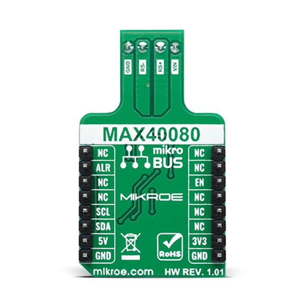 Current 6 Click as its foundation uses the MAX40080, a high-precision, fast sample-rate digital current-sense amplifier from Analog Devices. The MAX40080 measures current and common-mode voltage ranging from -0.1V to 36V and converts the data into digital form through an I2C-compatible two-wire serial interface allowing access to conversion results. Also, setting the input voltage sense using the I2C register, ±50mV or ±10mV, will allow one to select two measuring ranges from 0A to 1A or from 0A to 5A.