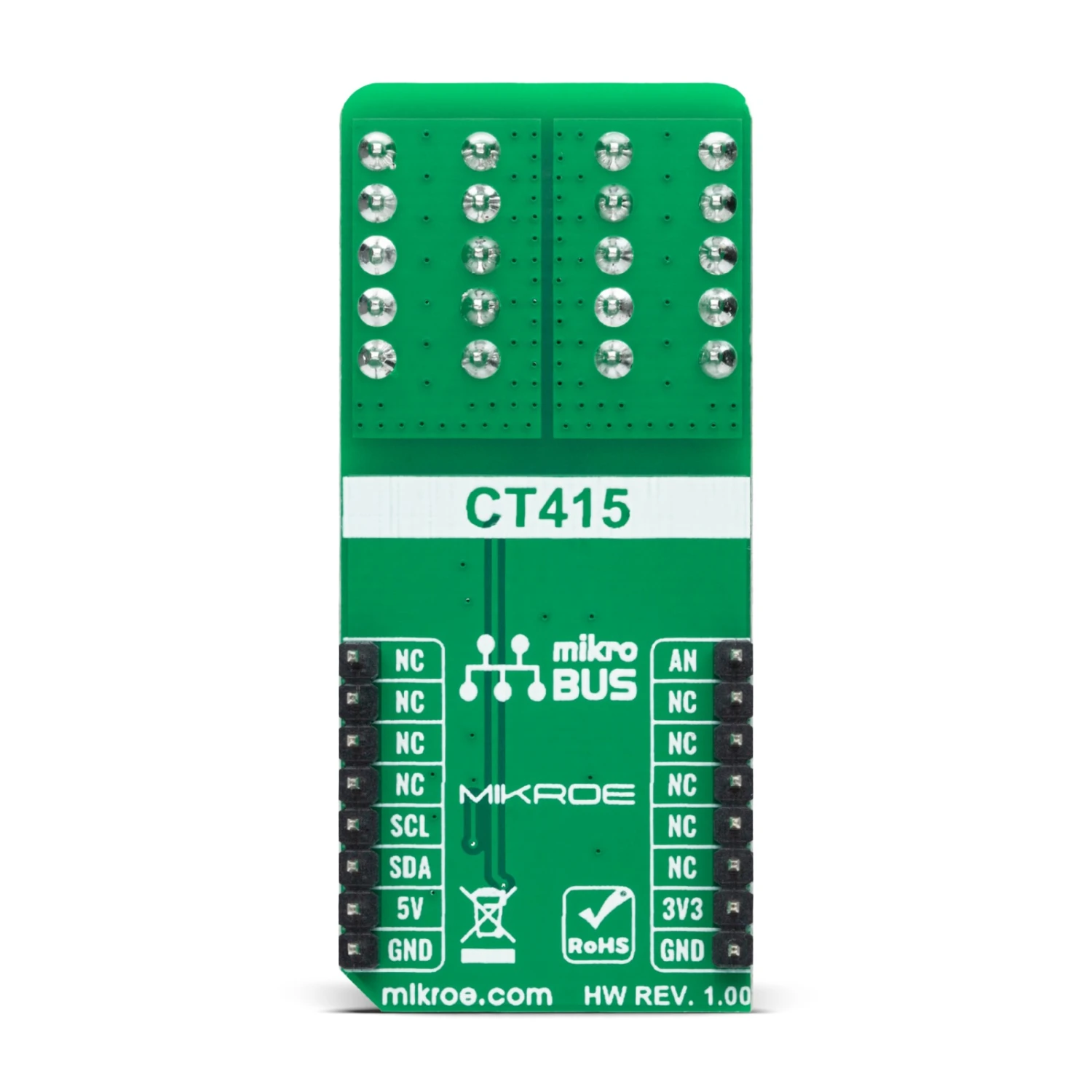 The output signal of the CT415-HSN830DR can be converted to a digital value using MCP3221, a successive approximation A/D converter with a 12-bit resolution from Microchip using a 2-wire I2C compatible interface, or can be sent directly to an analog pin of the mikroBUS™ socket labeled as AN. Selection can be performed by onboard SMD jumper labeled as ADC SEL, placing it to an appropriate position marked as EXT and INT.