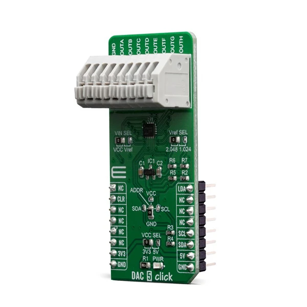 The voltage level of the logic section can be selected via VCC SEL jumper, between 3.3V and 5V. This allows for both 3.3V and 5V capable MCUs to use the I2C communication lines properly. For I2C address selection, DAC 5 Click has cross-shape jumper. There are four positions for I2C selection which can be selected with a SMD 0 ohms resistor. DAC 5 Click has Vref SEL jumper for choosing between 2,048 V and 1,024 V, where 1,024 V is achieved using a voltage divider. Another jumper is for VrefIN and choosing between Vref (1,024 and 2,048) and VCC (3,3V and 5V). Voltage outputs from DAC 5 Click can be connected through 9-therminal block where first is common GND and the last eight are VOUTA to VOUTH.