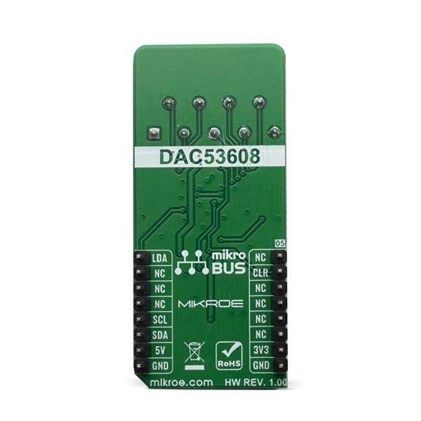 Low quiescent current, wide power supply range, and per channel power down option makes DAC53608 ideal for low power, battery operated system. The device communicates through I2C interface. These devices support I2C standard mode (100 Kbps), fast mode (400 Kbps) and fast+ mode (1 Mbps). These devices also have a load DAC (LDAC) pin that allows simultaneous DAC updates. LDAC pin is tied with a mikroBUS™ PWM pin. The I2C lines (SCL and SDA) are routed to the dedicated mikroBUS™pins.
