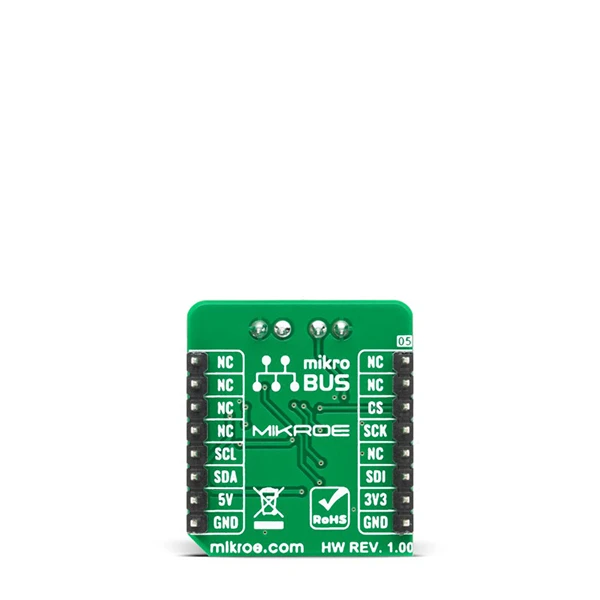 This Click board™ is designed to be operated with both 3.3V and 5V logic voltage levels that can be selected via VCC SEL jumper. This allows for both 3.3V and 5V capable MCUs to use both the I2C and SPI communication lines properly. However, the Click board™ comes equipped with a library that contains easy to use functions and an example code that can be used as a reference for further development.