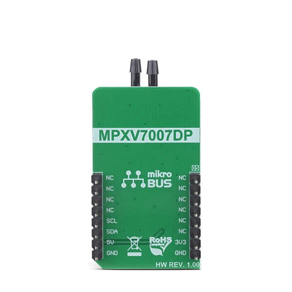 The MPXV7007DP sensor is shaped so two small tubes can be attached to it, simplifying its practical application. This makes this Click board™ an ideal solution for monitoring the pressure in different kinds of HVAC applications, hospital beds, respiratory systems, process control, and similar applications which rely on an accurate and reliable pressure monitoring.