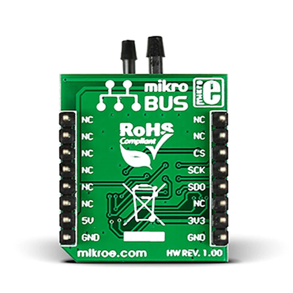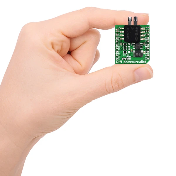 Diff Pressure Click carries NXP’s MPXV5010DP signal conditioned, temperature compensated and calibrated pressure sensor with two axial ports to accommodate industrial grade tubing. The Click is designed to run either on 3.3V or 5V power supply. It communicates with the target microcontroller over SPI interface (CS, SCK, MISO).