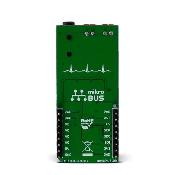 The Click communicates with the target MCU over SPI and the following mikroBUS pins: PWM, AN and INT. ECG 2 Click runs on 3.3V and 5V power supply.