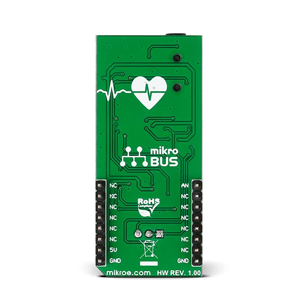 This is an ECG (or EKG) machine on a Click board™. It measures the electrical activity of a beating heart through electrodes taped to the skin. The board requires little setup, and the final measurement results can be displayed as an Electrocardiogram using a free Windows app.