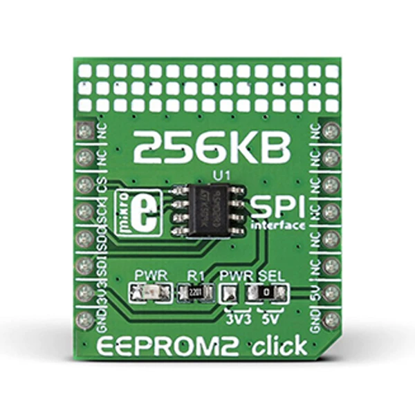 EEPROM2 Click provides 2 Mbit (2,097,152 bits) of Electrically Erasable and Programmable Read Only Memory, organized in bytes. In other words, this Click board™ is an EEPROM memory medium with the capacity of 256 KB. The used EEPROM module has an impressive endurance of 4,000,000 write cycles and data retention period of over 200 years. EEPROM module on this Click features an ESD protection. It also contains a memory page of 256 bytes, which can be permanently locked, once it is written. The Error Correction Code logic section ensures a reliable data output from the device.