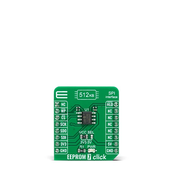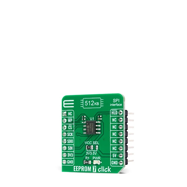 EEPROM 7 Click is based on the 25CSM04, a 4 Mb Serial EEPROM with a Serial Peripheral Interface (SPI), a 128-bit serial number, and enhanced Write Protection Mode from Microchip. The 25CSM04 is organized as 524,288 bytes of 8 bits each (512 Kbyte) and features a nonvolatile Security register independent of the 4 Mb main memory array. The first half of the Security register is read-only and contains a factory-programmed, globally unique 128-bit serial number in the first 16 bytes. It also includes a Software Device Reset function that allows the user to reset the device to its power-on default behavior without the need to power cycle the device.