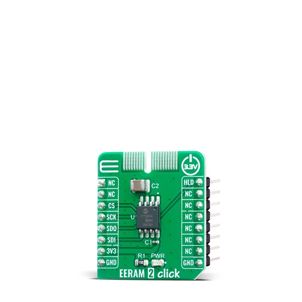 EERAM 2 Click is a standalone serial SRAM memory that includes shadow non-volatile backup. EERAM uses a small external capacitor to provide the energy needed to move the contents of the SRAM to the non-volatile cells when system power is lost. Unlike NVSRAM, no external battery is needed. EERAM offers unlimited SRAM read and write cycles and more than 100,000 backups to the non-volatile cells. Since power loss events are typically random or unpredictable, EERAM works in applications that absolutely cannot lose the quickly changing SRAM data on any sudden power loss. It provides designers of a data logging/black box or monitoring systems with a safe and accurate way to safely, reliably and automatically store the last data bytes prior to the power loss event. The Vcc is monitored inside the IC and can automatically handle the data movement between the SRAM and the non-volatile memory on any power disruption.